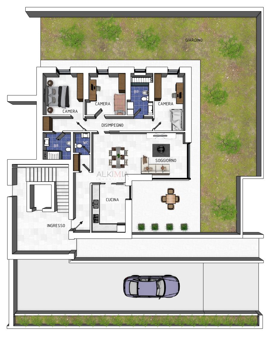L’ingresso conduce all’ampio soggiorno open space con cucina separata e finestrata, che si affaccia su un elegante patio esterno e sul meraviglioso giardino privato, ideale per pranzi, cene, relax all’aperto e momenti di convivialità in totale privacy. Completa la zona giorno un comodo bagno di servizio dotato di pratico antibagno utilizzabile come ripostiglio.
