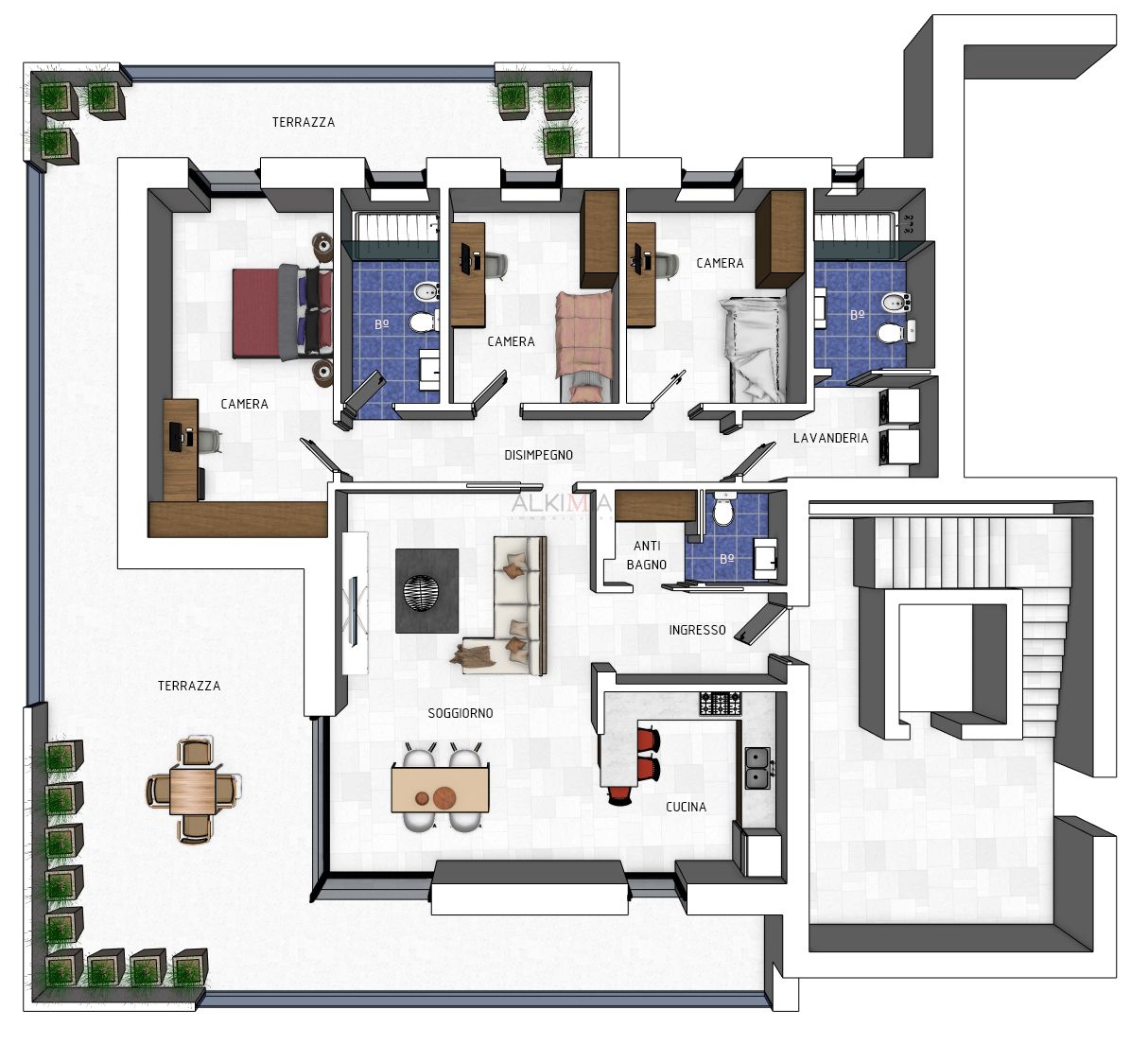 La zona notte comprende una camera matrimoniale con cabina armadio, due camere singole, due bagni finestrati studiati per garantire comfort e funzionalità ed una comoda lavanderia.